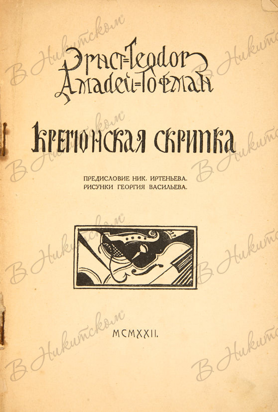 [Тираж 700 экз.]. Гофман, Э. Кремонская скрипка / пред. Ник. Иртеньева, рис. Георгия Васильева. М.: Изд-во «Созведие»; 7-ая тип. «Моспечать» Гофман, Э.-Т.-А. Кремонская скрипка / пред. Н. Иртеньева, рис. Г. Васильева. М.: «Созвездие», 1922.
