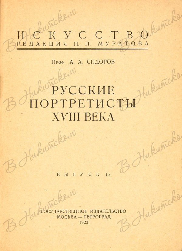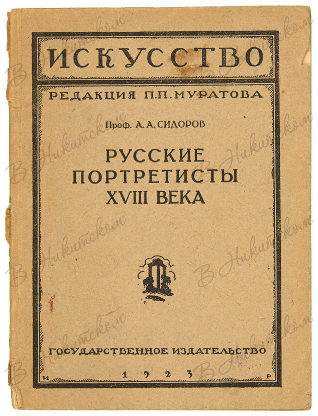 2. Проф. Сидоров, А.А. Русские портретисты XVIII века. М.: Гос. Изд., 1923. 41, [3] с., ил. 17,4 х 13,1 см. В орнаментированной издательской обложке. Незначительные загрязнения обложки. небольшие надрывы и утраты на корешке.
