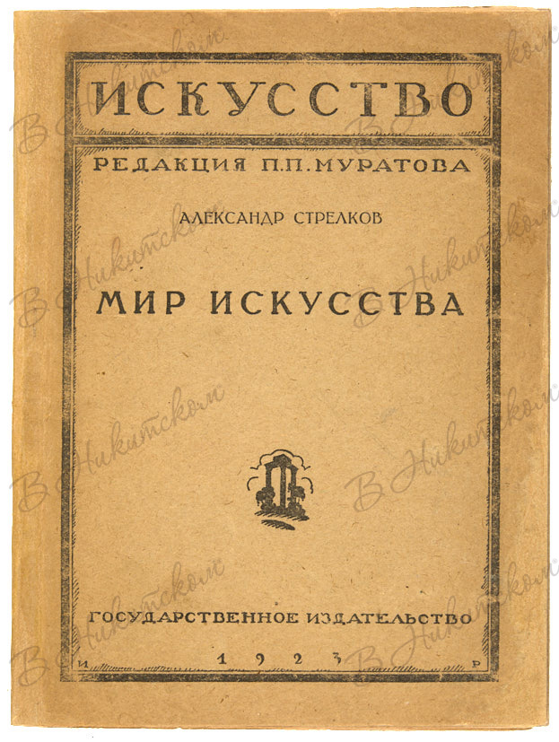 1. Стрелков, А. Мир искусства. М.: Гос. Изд., 1923. 27, [3] с., ил. 17,5 х 13 см. В орнаментированной издательской обложке. Потертости, следы аккуратной реставрации обложки, фронтисписа, титульного листа и нескольких страниц. Небольшие следы залития нижнего поля блока. В хорошем состоянии.