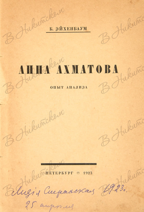 Эйхенбаум, Б. Анна Ахматова. Опыт анализа. Пб.: Гос. Трест «Петропечать», 1923.