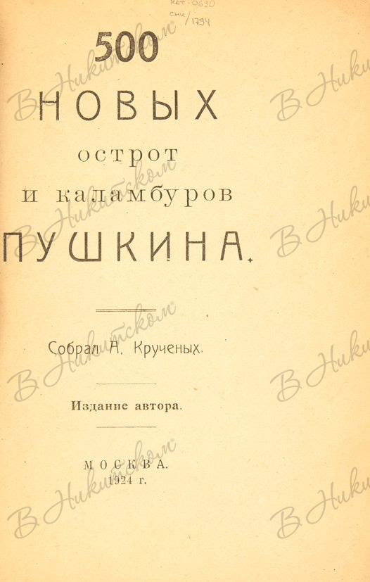 500 новых острот и каламбуров Пушкина / собрал А. Кручёных. М.: Издание автора, 1924.