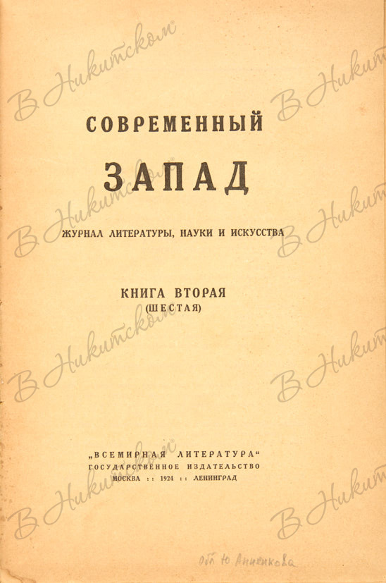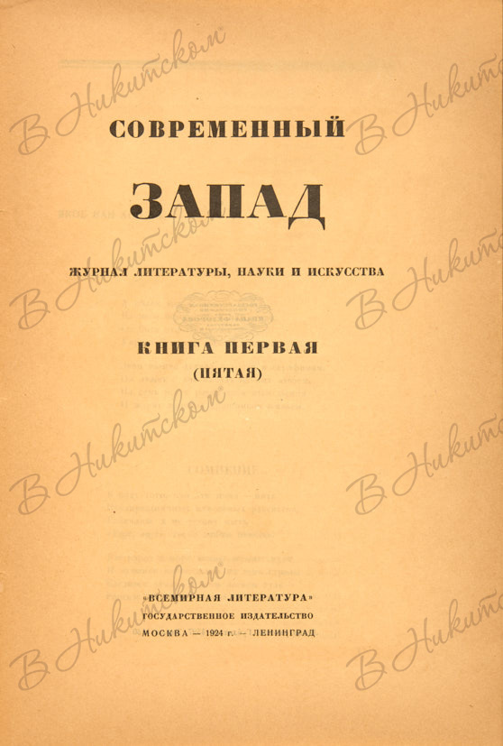 «Современный Запад» издавался в 1922–1924 гг., выходил в книжном формате. Журнал редактировался А.Н. Тихоновым, Е.И. Замятиным, К.И. Чуковским, а с третьего номера в состав редколлегии вошел московский искусствовед и критик А. Эфрос. Всего в течение трех лет было выпущено шесть номеров «Современного Запада», где впервые были напечатаны на русском языке многие произведения европейской и американской литературы.
