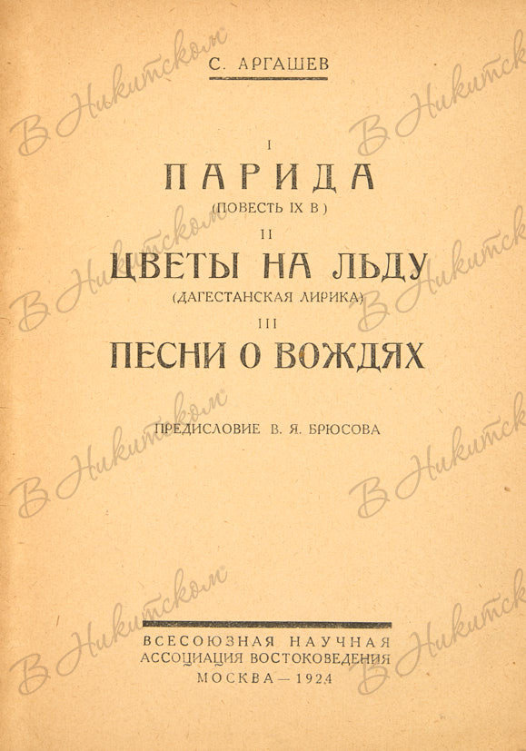 Аргашев, С. Парида. Цветы на льду. Песни о вождях / пред. В.Я Брюсова. М.: Всесоюзная научная ассоциация востоковедения, 1924.