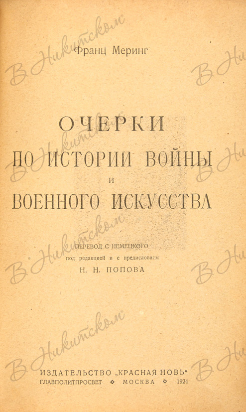 Меринг, Ф. Очерки по истории войны и военного искусства / пер. с нем. под ред. и с предисл. Н.Н. Попова. М.: Красная новь, 1924.
