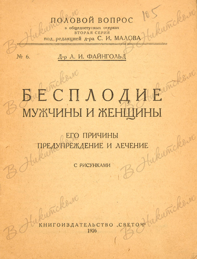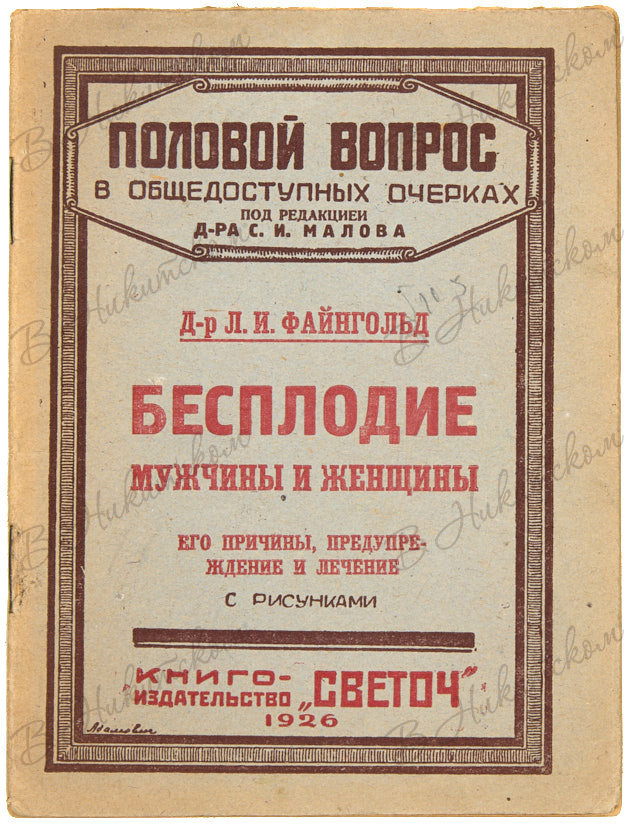 [Серия «Половой вопрос в общедоступных очерках»]. Д-р Файнгольд, Л.И. Бесплодие мужчины и женщины. М.: Кн-во «Светоч», 1926.