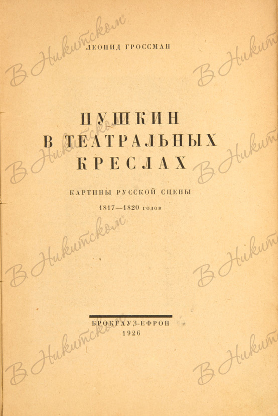 Гроссман, Л. Пушкин в театральных креслах. Л.: Изд-во Брокгауз-Ефрон, 1926.