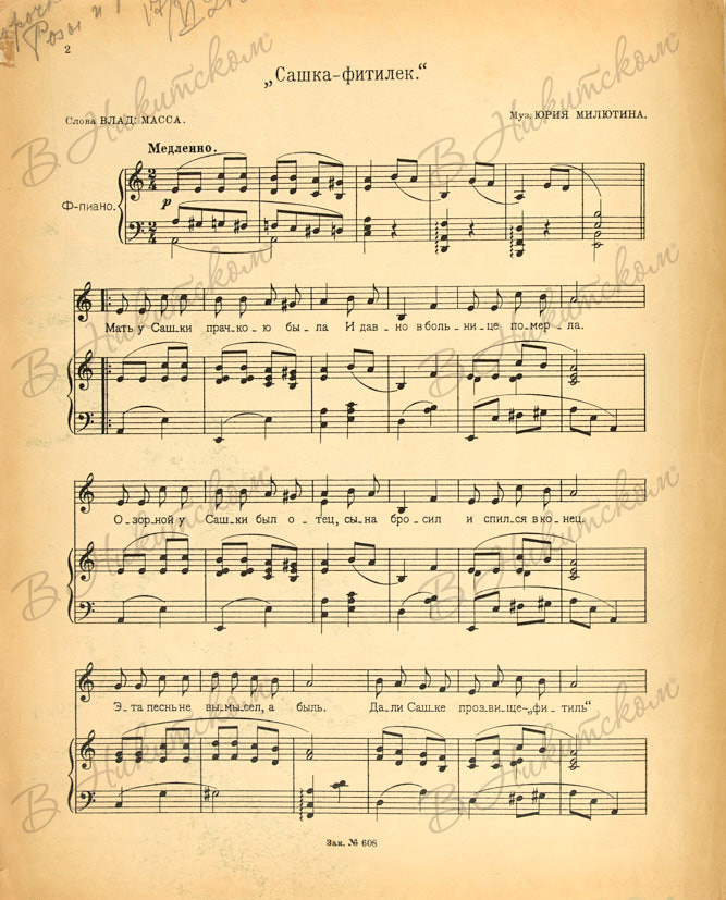 [Ноты]. Милютин, Ю. Сашка-Фитилек. Слова В. Масса. М.: Изд. автора, 1926.