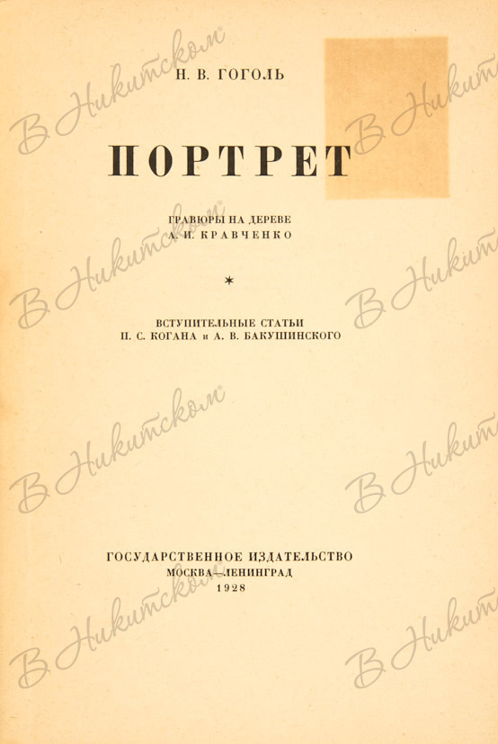 Гоголь, Н.В. Портрет / гравюры на дереве А.И. Кравченко ; вступ. статьи П.С. Когана и А.В. Бакушинского. М.; Л.: Гос. Изд., 1928.