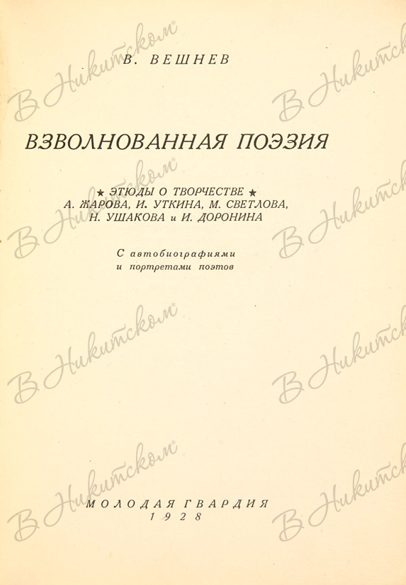 Вешнев, В. Взволнованная поэзия. Этюды о творчестве: А. Жарова, И. Уткина, М. Светлова, Н. Ушакова и И. Доронина. С автобиографиями и портретами авторов. М.: «Молодая гвардия», 1928.