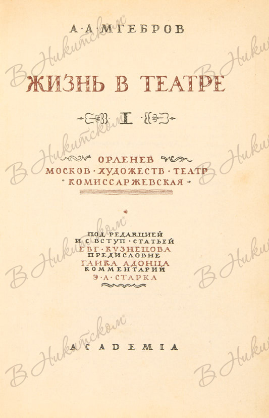 Мгебров, А.А. Жизнь в театре / оформл. С. Пожарского. [В 2 т.]. Т. 1. М.; Л.: Academia, 1929.
