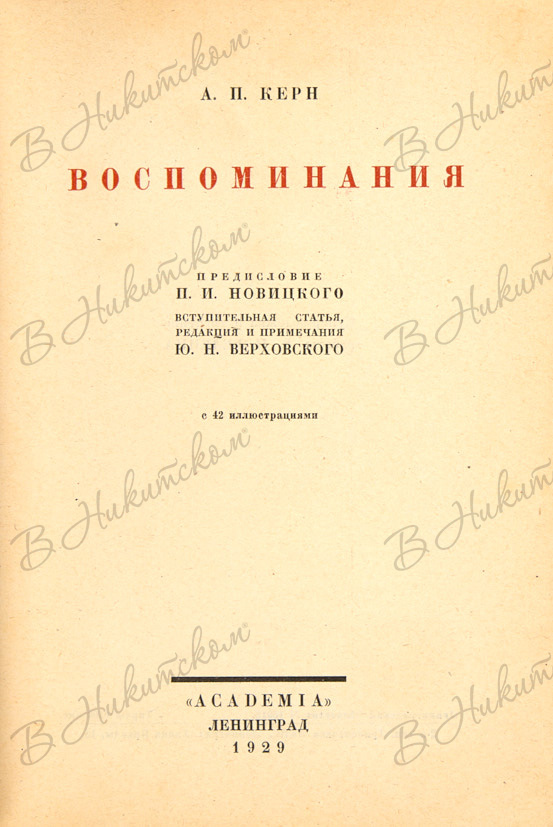 Керн, А.П. Воспоминания. С 42 иллюстрациями / пред. П.И. Новицкого; вступ. статья, ред. и прим. Ю.Н. Верховского. Л.: Academia, 1929.