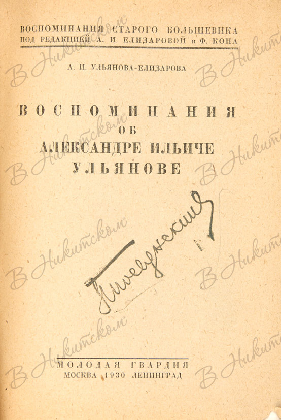 Ульянова-Елизарова, А.И. Воспоминания об Александре Ильиче Ульянове. (Воспоминания старого большевика / под ред. А.И. Елизаровой и Ф. Кона). М.; Л.: Молодая гвардия, 1930.