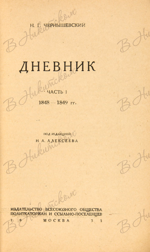 Чернышевский, Н.Г. Дневник. Ч. 1 [единств.] / под ред. Н.А. Алексеева. М.: Изд-во Всесоюзного общества политкаторжан и ссыльно-поселенцев, 1931.
