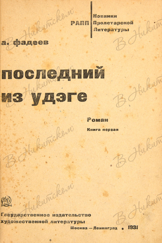 Фадеев, А. Последний на Удэге. Роман. Кн. 1. М.; Л.: ГИХЛ, 1931.