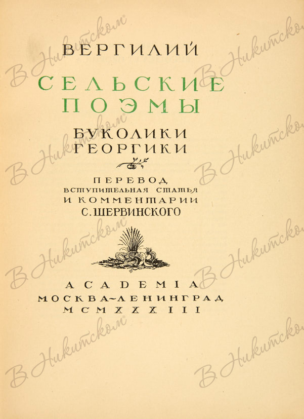 Вергилий. Сельские поэмы. Буколики. Георгики / пер., вступ. статья и комм. С. Шервинского; оформ. П.А. Шиллинговского. М.; Л.: Academia, 1933.