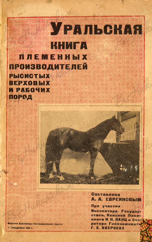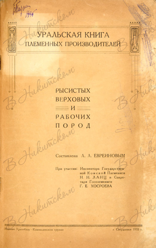 Уральская книга племенных производителей рысистых, верховых и рабочих пород / сост. А.А. Евреиновым; при участии: инспектора Государственной конской племкниги Н.Н. Ланц и секретаря Госплемкниги. Г.Е. Хосроева. Свердловск: Уралоблзу - Коневодческая группа, 1933.