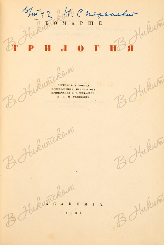 [Серия «Французская литература» / под ред. А.М. Эфроса]. Бомарше. Трилогия / перевод В.Д. Морица; пред. А. Дживелегова; примеч. Д.Е. Михальчи и Л.М. Галицкого. М.; Л.: Academia, 1934.