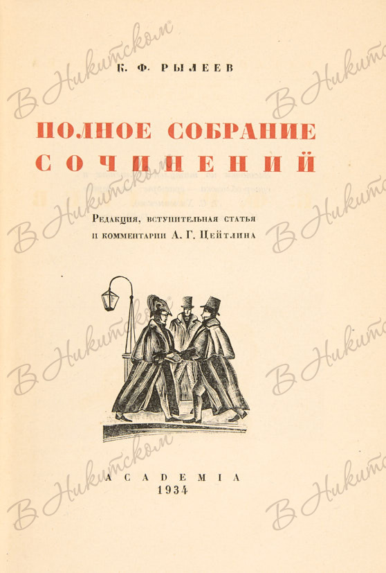 Рылеев, К.Ф. Полное собрание сочинений / оформ. гравюры на дереве Л.С. Хижинского, переплет по рис. Гайденкова; ред., вступ. статья и коммент. А.Г. Цейтлина; под общей ред. Л.Б. Каменева. М.; Л.: Academia, 1934.