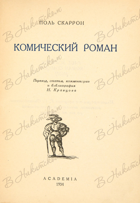 Скаррон, П. Комический роман / пер., ст., коммент. и библиография Н. Кравцова. М.; Л.: Academia, 1934.