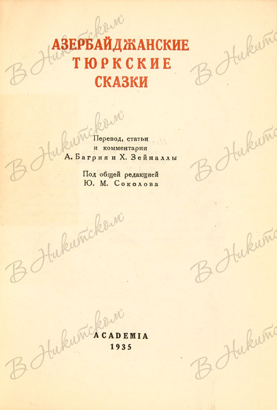 Азербайджанские тюркские сказки / пер., статьи и комм. А. Багрия и Х. Зейналлы, под общ. ред. Ю.М. Соколова, худ. Н. Ушакова. М.; Л.: Academia, 1935.
