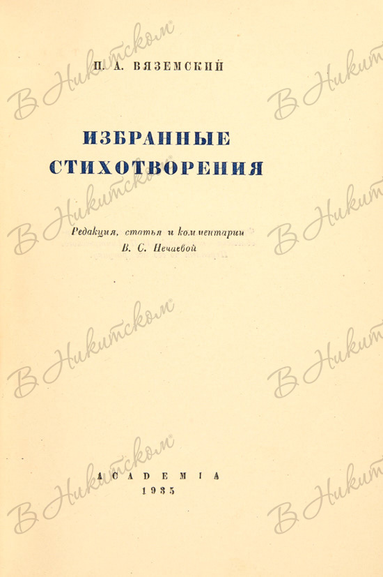 Вяземский, П.А. Избранные стихотворения / ред., статья и комментарии В.С. Нечаевой. М.; Л.: Academia, 1935.