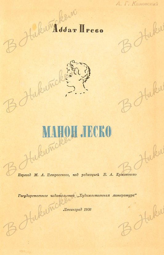 Аббат Прево. Манон Леско / пер. М.А. Петровского; под ред. Б.А. Кржевского. Л.: «Художественная литература», 1936.