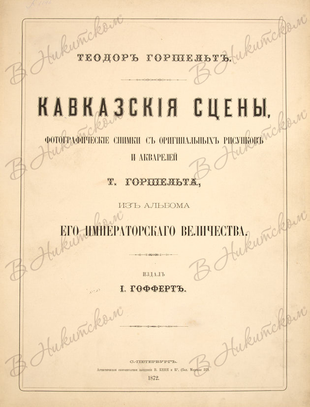 Горшельт, Т. Кавказские сцены. Фотографические снимки с оригинальных рисунков и акварелей Теодора Горшельта, из альбома Его Императорского Величества / издал И. Гофферт. СПб.: Артистическое скоропечатное заведение В. Кене и Ко, 1872.