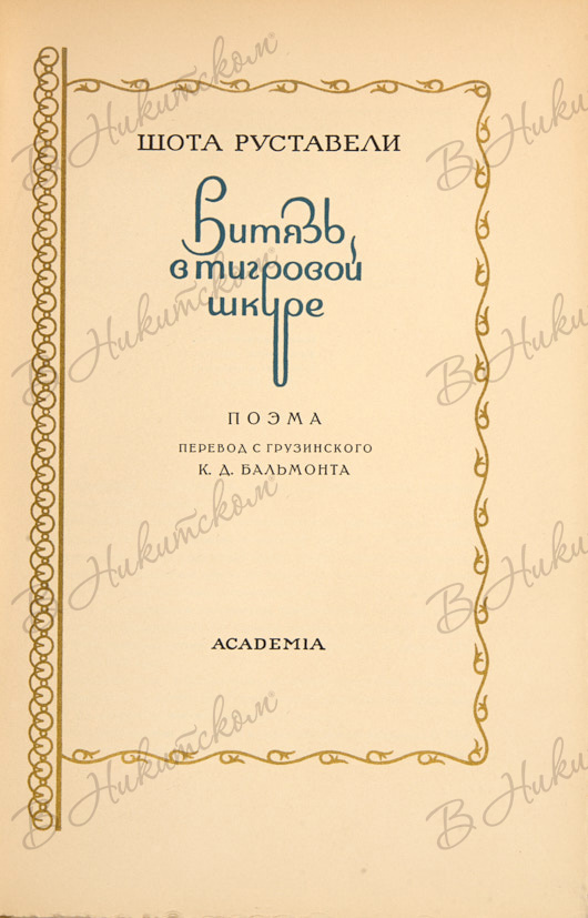Руставели, Ш. Витязь в тигровой шкуре / пер. с груз. К.Д. Бальмонта, [ил. Зичи, оформ. Б.В. Шварца]. [Л.]: Academia, 1936.