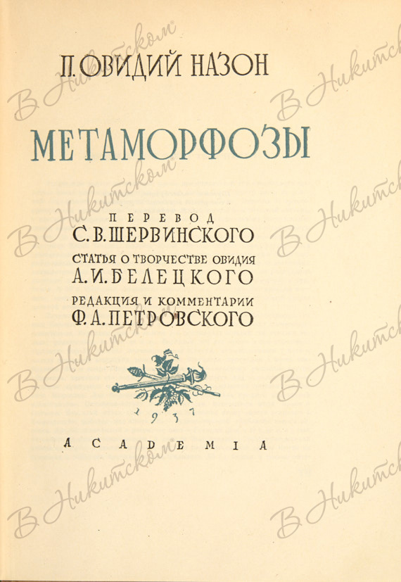 Овидий Назон, П. Метаморфозы / пер. С.В. Шервинского, под ред. и с комм. Ф.А. Петровского, вступ. ст. А.И. Белецкого, худ. Л.Е. Фейнберг. Л.: Academia, 1937.