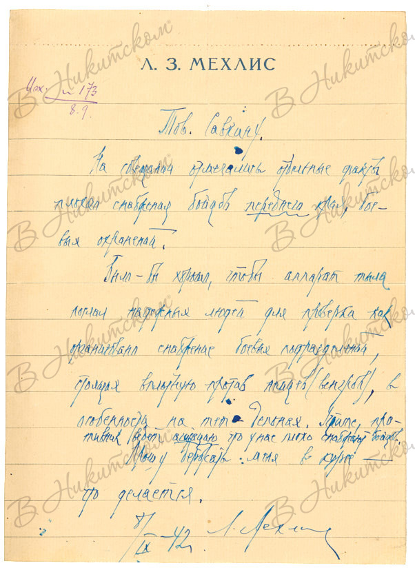 Мехлис, Л. [Автограф]. Письменное распоряжение Льва Михайловича Мехлиса на фирменном бланке с его подписью от 8.09.1942.