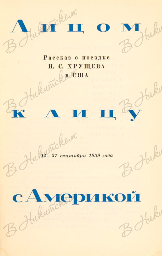 [Художник-оформитель А. Житомирский]. Лицом к лицу с Америкой. Рассказ о поездке Н.С. Хрущева в США. 15-27 сентября 1959 года. М.: ГИПЛ, 1959.