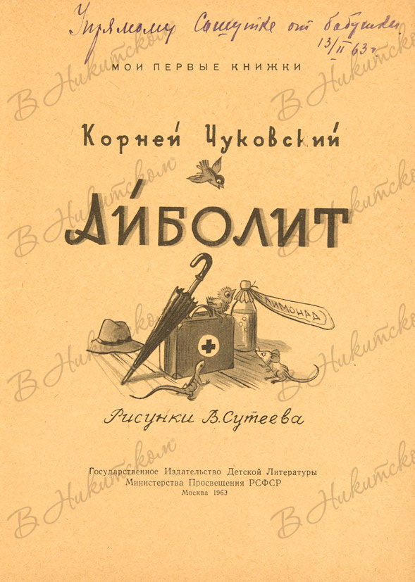 [Серия «Мои первые книжки»]. Чуковский, К. Айболит / рис. В. Сутеева. М.: ДЕТГИЗ, 1963.