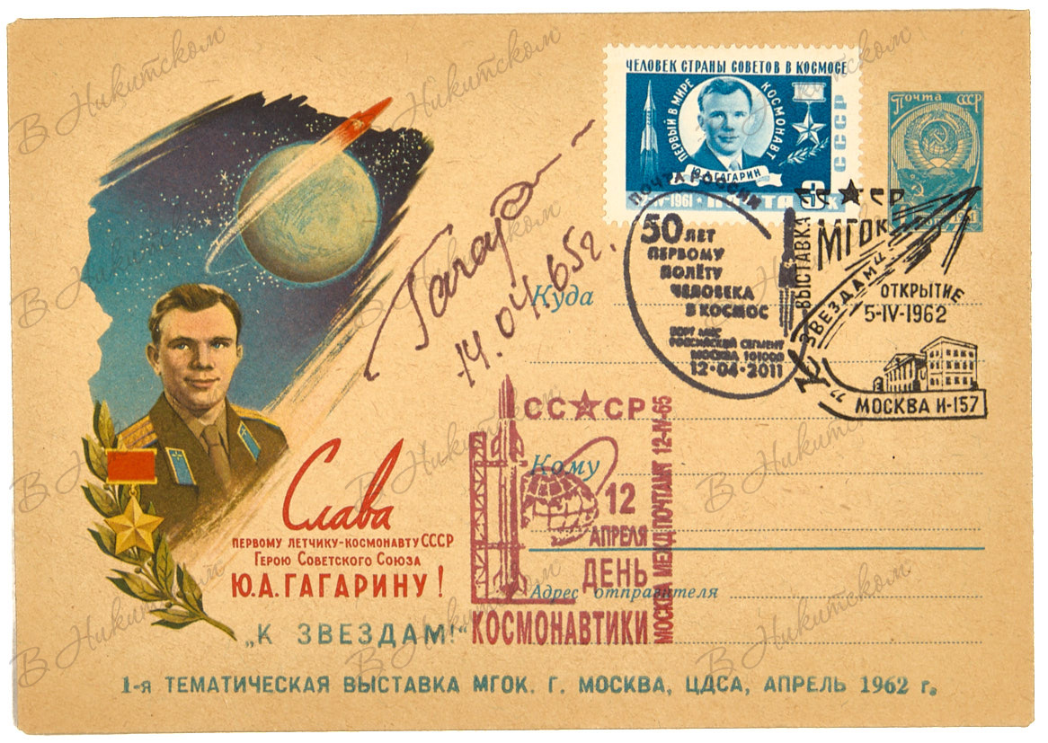 Гагарин, Ю. [Автограф]. Конверт в честь первого полета человека в космос. [1961].