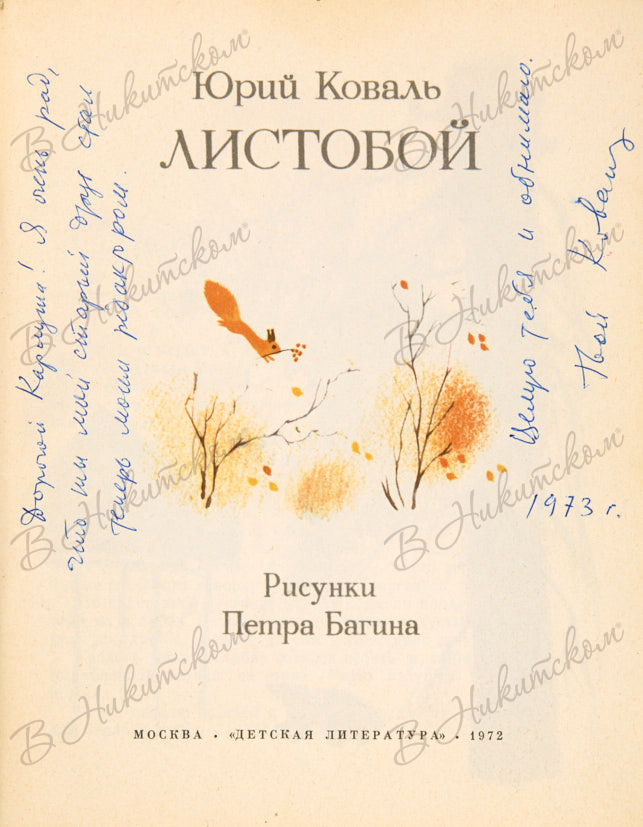 Коваль, Ю. [Автограф]. Листобой / рис. П. Багина. М.: Дет. лит., 1972.
