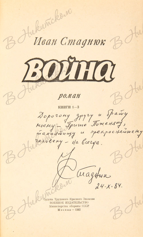 495 c. 26,5 х 17,5 см. В издательском переплете. На титульном листе дарственная надпись: «Дорогому другу и брату / моему - Грише Поженяну, /талантищу и прекраснейшему человеку - навсегда / Стаднюк / 25 X 1984».