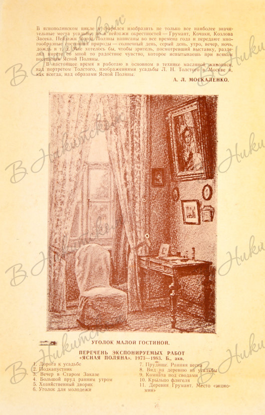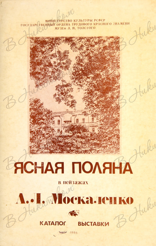 [Раскладной каталог]. Ясная Поляна в пейзажах А.Л. Москаленко [автограф]. Каталог выставки. М.: Тип. «Красный воин», 1986.