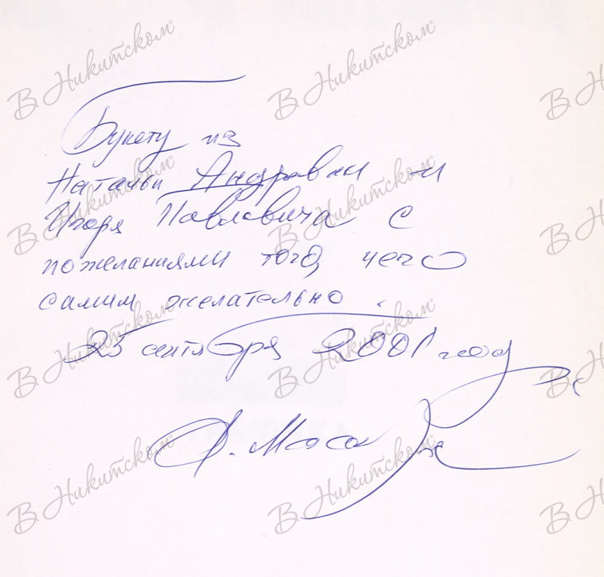 [142] с., ил. 27 х 22,5 см. В издательском переплете. На форзаце 1б автограф: «Букету из / Натальи Андреевны и / Игоря Павловича с / пожеланиями того, чего / самим желательно. / 25 сентября 2011 год / А. Мосийчук».