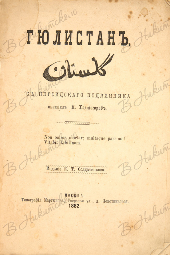 Гюлистан. «Цветник роз». Творение шейха Саади Ширази / перев. И. Холмогоров. М.: Издание К.Т. Солдатенкова; тип. Мартынова, 1882.