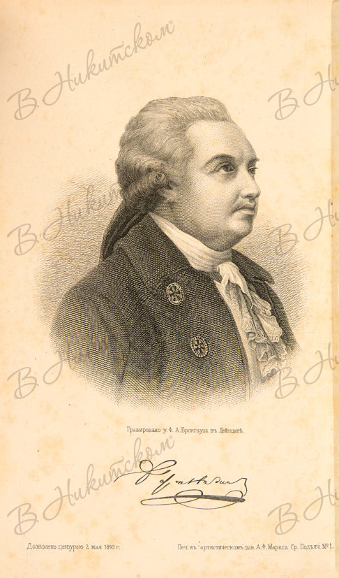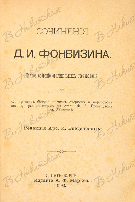 Фонвизин, Д.И. Полное собрание оригинальных произведений / С кратким биограф. очерком и портретом автора, гравир. на стали Ф.А. Брокгаузом. СПб.: Издание А.Ф. Маркса, 1893.