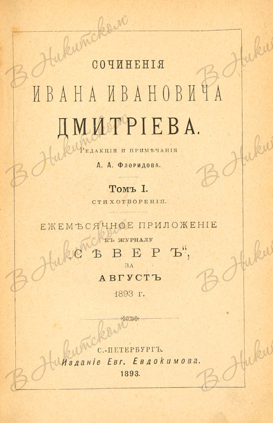 Сочинения Ивана Ивановича Дмитриева / рад. и примечания А.А. Флоридова. В 2 т. Т. 1-2. СПб.: Издание Евг. Евдокимова, 1893.