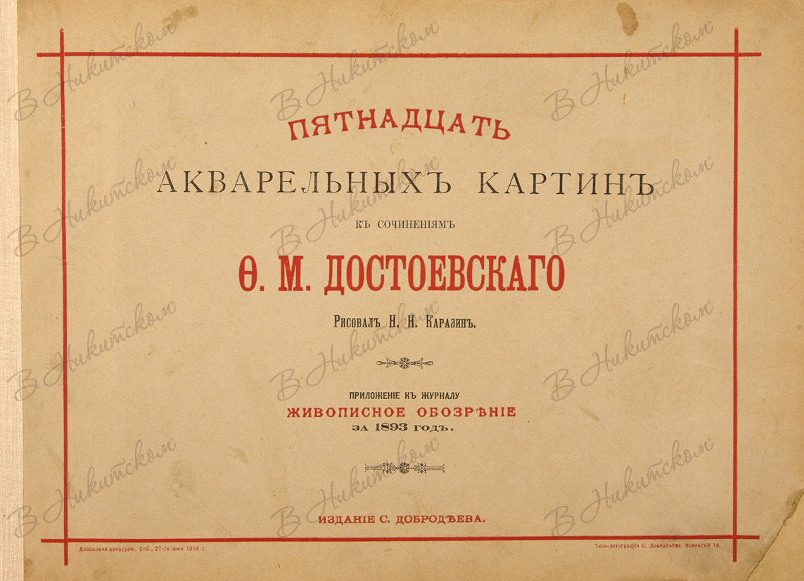 Пятнадцать акварельных картин к сочинениям Ф.М. Достоевского / рис. Н. Каразин. СПб.: Изд. С. Добродеева, 1893.