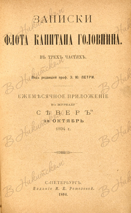Записки флота капитана Головнина. Ежемесячное приложение к журналу «Север» за октябрь 1894. В 3 ч. Ч. 1-3. СПб.: Изд. М.К. Ремезовой, 1894.