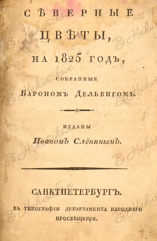 Северные цветы на 1825 год, собранные бароном Дельвигом. Изданы Иваном Слениным. СПб.: В Тип. Департамента Народного Просвещения, 1825.