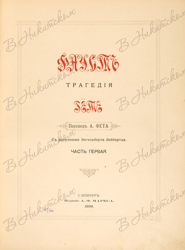Гете, И.В. Фауст. Трагедия / пер. А. Фета; рис. Э. Зейбертца. [В 2 ч.] Ч. 1-2. СПб.: Издание А.Ф. Маркса, 1899.