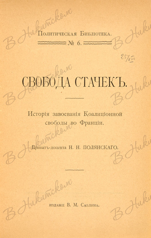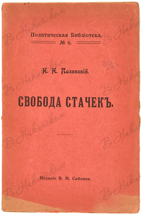 Полянский, Н. Свобода стачек. История завоевания коалиционной свободы во Франции. М.: Изд. В.М. Саблина, 1900.