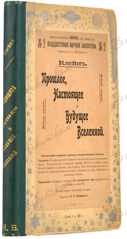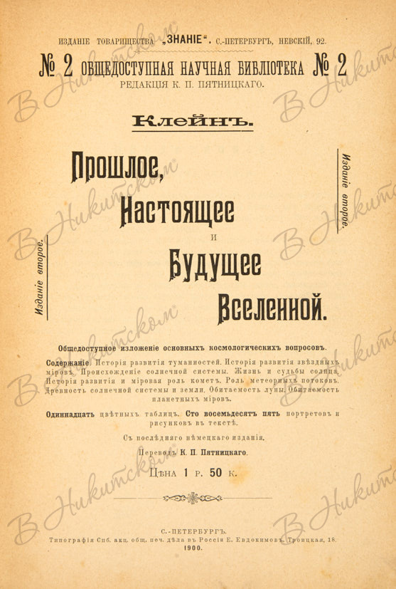 [Серия «Общедоступная научная библиотека»]. № 2. Клейн. Прошлое, настоящее и будущее Вселенной / ред. и перевод К.П. Пятницкого. СПб.: Тип. СПб. акц. о-ва печ. дела в России Е. Евдокимов, 1900.
