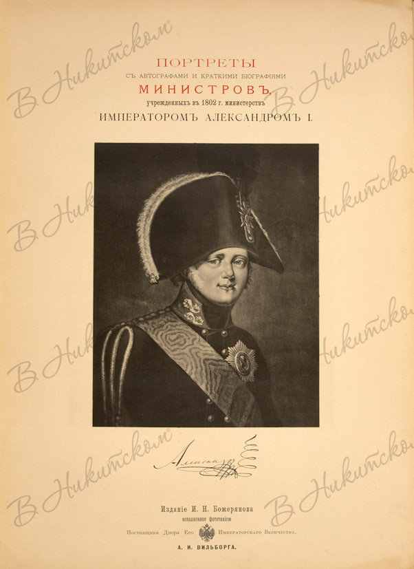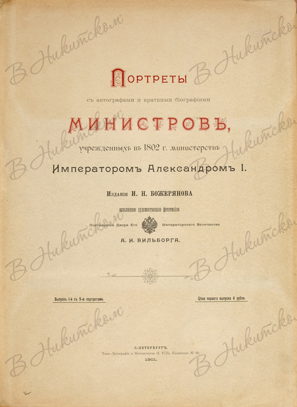 [Подносной экземпляр от издателя]. Божерянов, И.Н. Портреты с автографами и краткими биографиями министров, учрежденных в 1802 г. министерств императором Александром I. Вып. 1 [и единств.]. СПб.: Изд. И.Н. Божерянова, Типо-лит. и нотопечатня Н. Уль, 1901.