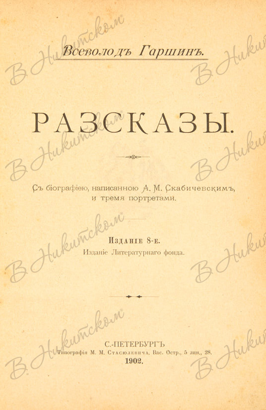 Гаршин, В. Рассказы / С биографией, написанной А.М. Скабичевским и тремя портретами. [В 3 кн.]. Кн. 1-3. Издание 8-. СПб.: Издания Литературного фонда; тип. М.М. Стасюлевича, 1902.