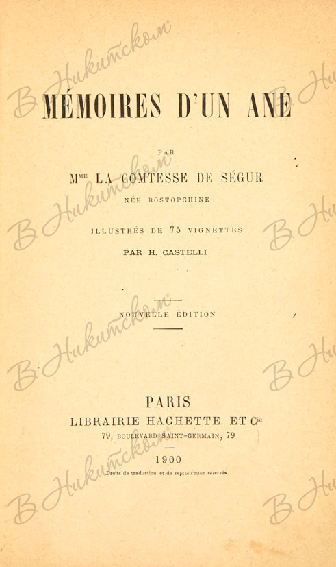 5. Графиня Сегюр. Воспоминания души. [La comtesse de Segur. Memoires D'un Ane. На французском языке]. Париж: Librairie Hachette et Cie, 1900. [4], 378, [2], 16 с., ил.