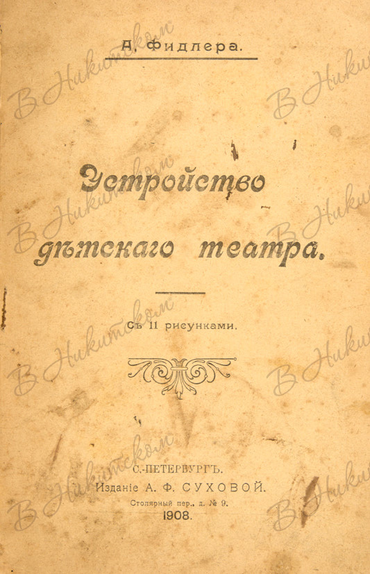 2. Фидлера, А. Устройство детского театра / С 11 рисунками. СПб.: Издание А.Ф. Суховой, 1908. 40 с., ил. Небольшой след аккуратной реставрации надрыва среднего поля на с. 6.